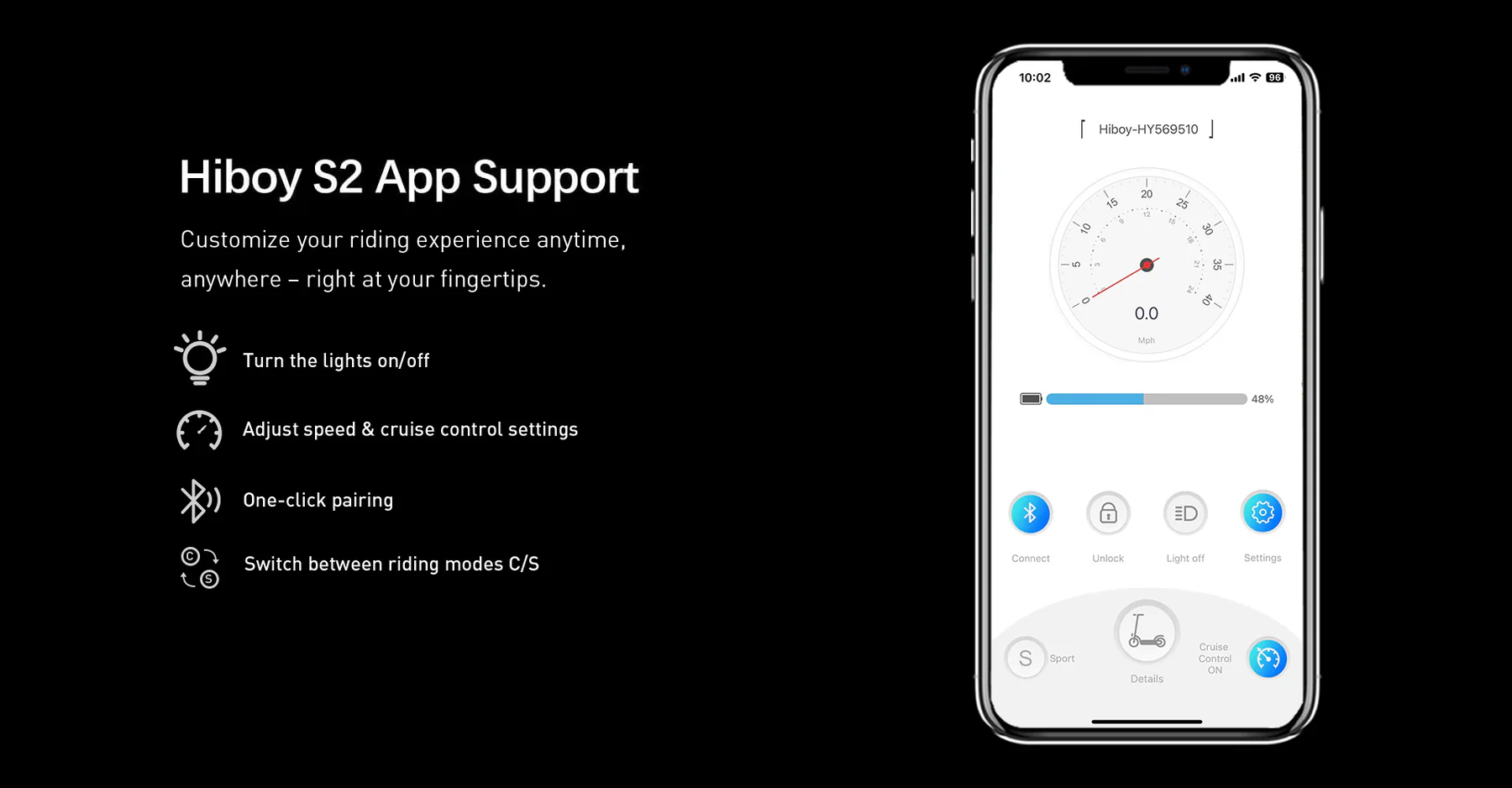 Customize your riding experience at your fingertips—lock the scooter, lights on/off, adjust speed & cruise control, one-click pairing, and more.